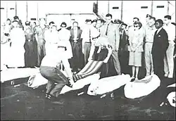 This final return placed him in the middle of the political unrest of the time, and he soon fell into the hands of the communist-inspired Congolese rebels of the Simba Rebellion.[7] His home was looted, the hospital and other buildings were damaged and two of his staff members were shot.[2] Under the unstable leadership of Christophe Gbenye, the rebels accused Carlson of being an American spy and took him as a hostage to Stanleyville. Carlson was held there and was mentally and physically tortured. In November 1964, Gbenye announced he would execute Carlson, prompting the U.S. government to begin negotiations for his release.[8] In Stanleyville, Carlson joined the American consul as a captive of the rebels. Upon a breakdown in negotiations, paratroopers were flown in and the rebels panicked. On November 24, 1964, some Simbas soldiers opened fire into a crowd, and Carlson and several others ran to a wall in hopes of escaping.[5] Before Carlson scaled the wall, he urged a clergyman to go first, and as he was climbing the wall after the clergyman, he was shot and killed by rebel gun fire.[2][9]