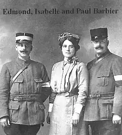 The First World War saw Barbier serving as an English interpreter for the French army.[2]: 45 He remained in correspondence with his colleagues at Leeds; indeed, in 1915 the Vice Chancellor even attempted, unsuccessfully, to convince the French authorities to allow Barbier to return to his Leeds duties.[7] Barbier's wife Cecile, meanwhile, was part of a Leeds committee for sending gifts and parcels to University employees serving in France.[7]