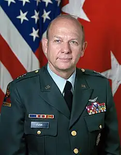 Funk was confirmed by the Senate for promotion to lieutenant general on October 25, 1993, effective November 1, 1993.[11][12] His final assignment was as commanding general of III Corps from October 1993 to December 1995.[13] His retirement as a lieutenant general was approved on December 5, 1995, with an official retirement date of January 1, 1996.[5][14]
