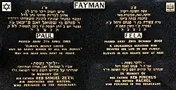 Fayman died unexpectedly on 7 April 1985, at the age of 63—on the Second Day of Passover (10 Nisan 5745)—just hours before he was scheduled to fly out for a meeting with Guinness executives to finalise a very important business deal. He is buried alongside his wife at the Chevra Kadisha Cemetery in Springvale.[51] His business interests were passed on to his family members, who continue to manage the Fayman International Group of Companies—which is primarily engaged in produce wholesaling and biochemical production.[52]