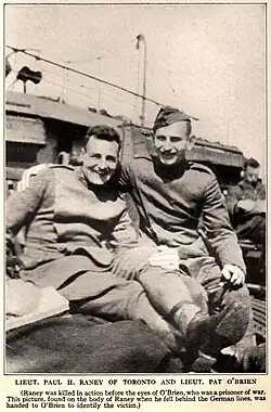 A photo of Raney and O'Brien was found on Raney's body, and given to O'Brien by the Germans. When Raney did not return from his patrol, a letter was dispatched two days later to his family in Canada, stating that he had gone missing. A very short note was later dropped over the British lines by the Germans, addressed from Patrick O'Brien to his commanding officer, stating simply "Paul Raney killed." This information was taken as official soon after O'Brien escaped from Courtnai prison in Belgium, and returned to Canada. O'Brien visited Raney's parents in Toronto to inform them of what he knew, and to bring them a map of his grave. He preserved this map through a difficult escape which included swimming through canals. This map is no longer extant. Regardless of its ultimate fate, ground fighting (and shelling) over the same territory (near Roeselare, Belgium) in 1918 would have rendered nearly any map or grave marker largely useless. Subsequent attempts by the War Graves Commission (after repeated appeals by his father to them) failed to locate any trace of Raney's remains or final resting place, which remains unknown.
