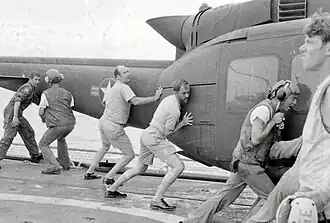 By the end of the day, more than a dozen Huey and Bell 205 helicopters landed and were pushed over the side, saving some 200 South Vietnamese citizens and 2 Marines from a Bell AH-1 gunship that had run out of fuel providing air cover for U.S. ground forces in Saigon. When an RVN Army CH-47 Chinook arrived, too large to land with some 20 evacuees and bingo on fuel after being waved off by every other ship, Kirk's crew gathered on the fantail to catch jumping passengers as pilot Ba Nguyen hovered just overhead. Once everyone, including Ba's 10 month old daughter Mina was safely aboard, he flew the Chinook safely away from the ship where he jumped into the sea himself and ditched the Chinook.[7][8]