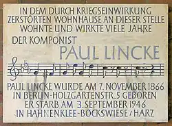 In 1943 Lincke toured Marienbad, Bohemia, to conduct Frau Luna, whose first performance in 1899 is now regarded as the birth of the Berlin operetta. During his absence, his house and his music publisher in Berlin were bombed.