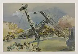 At the start of World War Two Nash was appointed by the War Artists' Advisory Committee to a full-time salaried war artist post attached to the Royal Air Force and the Air Ministry. Nash was unpopular with the Air Ministry representative on the WAAC committee, partly because of the modernist nature of his work and partly because the RAF wanted the WAAC artists to concentrate on producing portraits of their pilots and aircrew.[39] Whilst still a salaried WAAC artist Nash produced two series of watercolours, Raiders and Aerial Creatures. Raiders, or Marching Against England, was a set of studies of crashed German aircraft set in English rural landscapes with titles such as Bomber in the Corn, The Messerschmidt in Windsor Great Park and Under the Cliff. Whilst the Air Ministry could appreciate the patriotic intent and propaganda value of those works, the Aerial Creatures series, with its anthropomorphic depictions of British aircraft, displeased the Air Ministry so much they insisted Nash's full-time contract was ended in December 1940. The Chairman of WAAC, Kenneth Clark was aghast at this development and in January 1941 the Committee agreed to put aside £500 to purchase works from Nash on the theme of aerial conflict.[40][41] Nash worked intermittently under this arrangement until 1944 to produce four paintings for WAAC. The first two of these were Totes Meer (Dead Sea) and Battle of Britain.