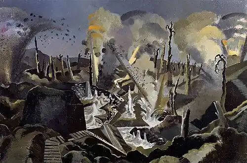 Nash began officer training in August 1916 and was sent to the Western Front in February 1917 as a second lieutenant in the Hampshire Regiment.[10] He was based at St. Eloi on the Ypres Salient at a relatively quiet time and although the area did come under shelling, no major engagements took place while he was there. Whilst clearly aware of the destruction that had taken place there, he was delighted to see that, with spring arriving, the landscape was recovering from the damage inflicted on it.[11] However, on the night of 25 May 1917, Nash fell into a trench, broke a rib and, by 1 June, had been invalided back to London. A few days later the majority of his former unit were killed in an assault on a position known as Hill 60.[7] Nash considered himself lucky to be alive. While recuperating in London, Nash worked from sketches he had done at the Front to produce a series of twenty drawings, mostly in ink, chalk and watercolours, of the war. Whilst some of these pieces showed the influence of the Vorticist movement and their manifesto,[10] the literary magazine BLAST, the majority concerned the spring landscape and were similar in tone to his pre-war work. Chaos Decoratif, for example, shows part of a trench and a shattered tree amid a scene of almost pastoral calm.[11] The collection was well received when exhibited in June that year at the Goupil Gallery. A further exhibition of these drawings was held in Birmingham in September 1917.[12] As a result of these exhibitions, C. R. W. Nevinson advised Nash to approach Charles Masterman, head of the government's War Propaganda Bureau, to apply to become an official war artist. Nash was with a reserve battalion near Portsmouth, preparing to return to France in a combat role, when he received word that his commission as a war artist had been approved.[7]