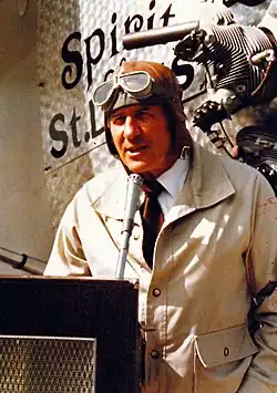 ![]() Poberezny dressed as Charles Lindbergh following his test-flight of EAA's Spirit of St. Louis replica on the 50th anniversary of its transatlantic flight, 1977 | |