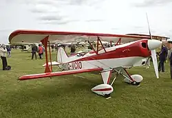 Poberezny flew over 500 aircraft types, including over 170 home-built planes throughout his life.[18][5] He was introduced to aviation in 1936 at the age of 16 with the gift of a donated damaged WACO Primary Glider that he rebuilt and taught himself to fly.[19] A high school teacher owned the glider and offered to pay Poberezny to repair it. He hauled it to his father's garage, borrowed books on building/repairing airplanes, and completed the restoration soon after. A friend used his car to tow the glider into the air with Poberezny at the controls; it rose to around a hundred feet when he released the tow rope and coasted to a gentle landing in a bed of alfalfa.[20] A year later, Poberezny soloed at age 17 in a 1935 Porterfield and soon co-owned an American Eagle biplane.[21]
