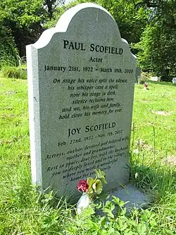 Scofield died from leukaemia[37] on 19 March 2008 at the age of 86 at the Royal Sussex County Hospital[2] in Brighton, East Sussex, England. His memorial service was held at Westminster Abbey on the first anniversary of his death.[2] His wife Joy died four years later on 7 November 2012, aged 90.