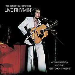 Paul Simon in Concert: Live Rhymin' is a live album by Paul Simon, released in March 1974 by Columbia Records. It was recorded in the wake of the release of There Goes Rhymin' Simon, which produced a number of hit singles ("Kodachrome" and "Loves Me Like a Rock") and radio staples ("Something So Right" and "Take Me to the Mardi Gras"), at the University of Notre Dame in Indiana and Carnegie Hall in New York during Simon's 1973–74 tour.[1] The album featured both Latin and gospel influences, both in the arrangements and the performance style of the guests
