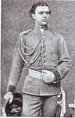 At the request of his father to King Maximilian II of Bavaria, he was appointed on 15 November 1861 as junior lieutenant in the 2nd Bavarian artillery regiment (military registry no. KA OP 69 547)[2] and was assigned as orderly officer of then Crown Prince Ludwig on 1 May 1863. Ludwig and Paul became close friends after spending three weeks together in Berchtesgaden in September 1863.[3] After Ludwig's accession to the throne in 1864, Paul was promoted to personal aide-de-camp of the king on 18 January 1865.[4] In the following two years, Paul von Thurn und Taxis, who matched the king in his good looks,[5] became the closest friend and confidant of the monarch.