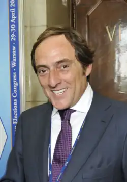 In the 2002 legislative elections, the CDS-PP won 8.7 percent of the vote and 14 Parliament seats, which were sufficient to form a government majority with the PSD that won the election.[23] The CDS-PP participated in two coalition governments from April 2002 to March 2005 and Portas served as Minister of State and National Defence in the first (Durão Barroso) and Minister of State, National Defence and Maritime Affairs in the second (Pedro Santana Lopes). As Minister of Defence, he presided over important reforms of the military, such as abolishing conscription,[24] but his most lasting legacy was the upgrade of military equipment in the context of the 2003 "Military Programming Law"[25] that envisaged a major boost in military equipment spending to 5,341 million euros,[26] including two submarines and 260 combat vehicles that would become the subject of much controversy after he left office. As Minister of Defense, Paulo Portas was also determinant in aligning Portugal with George W. Bush's 2003 Iraq invasion by saying he had personally "seen irrefutable evidence of weapons of mass destruction" while on an official visit to Washington. He was subsequently awarded the Department of Defense Medal for Distinguished Public Service by the USA's Defense Department.[27]