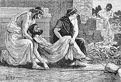 According to Thucydides, Diodorus and Polyaenus, Pausanias, pursued by the ephors, took refuge in the temple of Athena "of the Brazen House" (Χαλκίοικος, Chalkioikos) (located in the acropolis of Sparta). Pausanias' mother Theano (Ancient Greek: Θεανώ) immediately went to the temple, and laid a brick at the door saying: "Unworthy to be a Spartan, you are not my son" (according to Diodorus). Following the mother's example, the Spartans blocked the doorway with bricks and forced Pausanias to die of starvation. After Pausanias' body was turned over to relatives for burial, the divinity through the Oracle of Delphi showed displeasure at the violation of the sanctity of supplicants. The oracle said that Athena demanded the return of the supplicant. Unable to carry out the injunction of the goddess, the Spartans set up two bronze statues of Pausanias at the temple of Athena. [19][20][21]