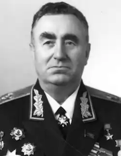 Pavel Fyodorovich Batitsky (Ukrainian: Павло Федорович Батицький; Russian: Па́вел Фёдорович Бати́цкий; 27 June 1910 – 17 February 1984) was a Soviet military leader awarded the highest honorary title of Hero of the Soviet Union in 1965 and promoted to Marshal of the Soviet Union in 1968. Batitsky served in the Red Army from 1924 and was commander-in-chief of the Air Defence Forces from 1966 to 1978. Following the death of Joseph Stalin in 1953, he was chosen to personally execute Lavrentiy Beria, the former head of the NKVD.
