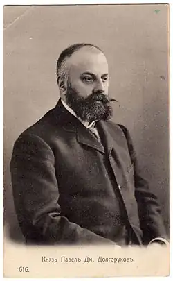 Prince Pavel Dmitrievich Dolgorukov (Russian: Князь Па́вел Дми́триевич Долгору́ков, tr. Pavel Dmitrievič Dolgorukov; 21 Nay 1866 – June 9, 1927) was a Russian landowner and aristocrat who was executed by the Bolsheviks in 1927.[1]