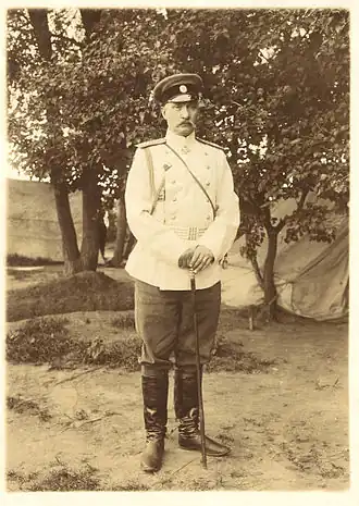 From 1903, Mischchenko was commander of the Trans-Baikal Cossack Brigade. During the Russo-Japanese War of 1904-1905 he commanded a separate East-Baikal Cossack Brigade, which was active in many of the battles of that war. Initially, his forces were in Korea, with instructions to obstruct the landing of the Japanese First Army and its march towards Manchuria. However, after several minor skirmishes, Mischchenko retreated across the Yalu River.[1] He played a minor role on the flanks of the Battle of the Yalu River,[2] and was also part of the Russian defenses at the Battle of Hsimucheng, and Battle of Te-li-Ssu. At the Battle of Liaoyang and at the Battle of Shaho, he commanded the Russian cavalry formations covering the rear guard of the Russian retreat.[1][3] He was promoted to lieutenant general in October 1904, and appointed commander of the new Cavalier Corps in December 1904 and led a major raid south on 6 January 1905 with 6000 horsemen on a mission to destroy Japanese supplies stockpiled at Niuzhuang. The mission was a disaster, and the force returned twelve days later with massive casualties.[1] He was wounded in the leg during the Battle of Sandepu and although reinstated as commander of the Cavalier Corps in March 1905, was not in the Battle of Mukden.