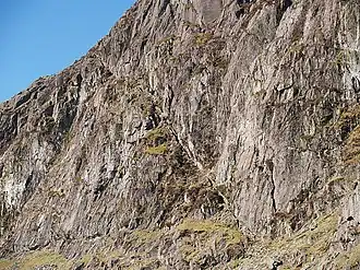 The face is an outcrop of the formation named for the fell, the Pavey Ark Member. This consists of pebbly sandstone and breccia and is set within the Seathwaite Fell Formation of volcaniclastic sandstone with interbeds of tuff, lapilli tuff, breccia and conglomerate.[2]