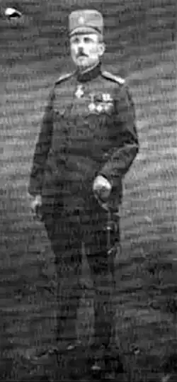 In Povardarie, in late July 1906, lieutenant Pavle Blažarić-Bistrički was named the head of the mountain headquarters in Poreč replacing Nikola Janković-Kosovski and Panta Radosavljević-Dunavski. By September of that year, his men entered the villages of the Veles and Čaška regions—Oreš, Papradište, Čaška, Dolnjane, Nežilovo, and Teovo—and immediately established law and order. The invaders withdrew from there.[1] Because of tuberculosis that he contracted while in active Chetnik service, he was recalled to Serbia in the spring of 1907. Upon his return to Serbia, he was appointed as the leader of the border troops in Kuršumlija.