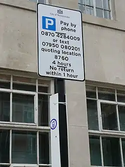A sign telling people that they must pay for parking by telephone. Seen in the Westminster area of London.