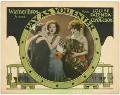 Pay as You Enter is a 1928 American synchronized sound comedy film directed by Lloyd Bacon and starring Louise Fazenda, Clyde Cook, and William Demarest.[2][3] While the film has no audible dialog, it was released with a synchronized musical score with sound effects using the sound-on-disc Vitaphone process.[4] The title refers to the fare collection system used on a streetcar.