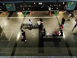 The station also features Art Seats, which have creative design to enhance the commuters' experience on the line.[43] Two entries were selected through the International Art Seats Design Competition in 2006. The first entry – Matrix, which received the top prize in the international competition – consists of a series of benches engraved with the name of the station in a dot-matrix style on the seat surface. Another entry, Rain, showcases steel seats in the shape of water puddles. These seats are also displayed in the other CCL interchange stations.[44]