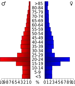 In the county as of 2000, the population was spread out, with 19.60% under the age of 18, 25.90% from 18 to 24, 26.20% from 25 to 44, 17.60% from 45 to 64, and 10.80% who were 65 years of age or older. The median age was 28 years. For every 100 females, there were 103.30 males. For every 100 females age 18 and over, there were 102.60 males.