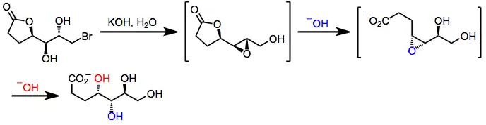 The Payne rearrangement occurs with inversion of stereochemistry at C-2. Substrates containing multiple adjacent hydroxyl groups may undergo "cascade" epoxide migrations with inversion at each site of nucleophilic attack. In one example, inversion of three contiguous stereocenters results after two epoxide migrations, opening of the epoxide by carboxylate, and hydrolysis of the resulting lactone.[7]