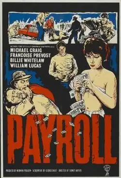 Payroll is a 1961 British neo-noir crime thriller film directed by Sidney Hayers and starring Michael Craig, Françoise Prévost, and Billie Whitelaw.[1] The screenplay by George Baxt was adapted from Derek Bickerton's 1959 novel of the same name. The film revolves around a group of criminals who plan and execute a wages robbery, which ultimately ends in disaster. The movie is one of the most highly regarded crime films from Anglo-Amalgamated.[2]