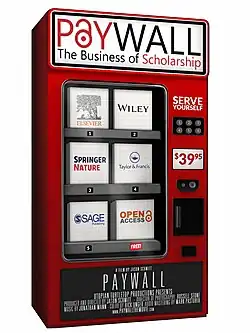 Paywall: The Business of Scholarship is a 2018 American documentary film directed by Jason Schmitt. It documents the high profits and business practices of the academic publishing industry and the efforts of the open access movement to reform it. The film premiered at the Landmark Theater (E-Street) in Washington, DC on September 5, 2018, and was subsequently freely released online under a Creative Commons license Attribution 4.0 in keeping with the spirit of the film.[2]