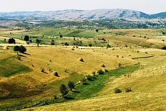 In the geologic past, the field was a large lake, of which only a small remnant in Sjenica near the village of Tuzinje remains.[4] This lake gradually drained through karst ruptures, leaving marshy remnants in the lowest parts, around the flow of the sinking river Boroštica.[6] Those areas are home to a wet peat bog habitat that is unique for a karst area. The soil is mostly karst interspersed with pastures. The economy of the area relies primarily on livestock breeding, chiefly of sheep. Pešter is famous for its dairy products, especially the "Sjenica cheese" (Sjenički sir), as well as lamb and pršut (or prosciutto).[5]