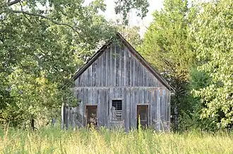 The Pea Ridge School Building is a historic schoolhouse in rural southern Marion County, Arkansas. It is located on the north side of County Road 5008, about 4 miles (6.4 km) south of Bruno. It is a single-story wood-frame structure, with a gable roof, board and batten siding, and a stone foundation. The main facade faces west, and has a pair of doorways with a sash window between. The interior is finished in horizontal boards, those on the east painted black to provide a blackboard. Built c. 1899, it is one of Marion County's least-altered one-room schoolhouses, having only lost its belfry when the tin roof was installed in the 1920s.[2]