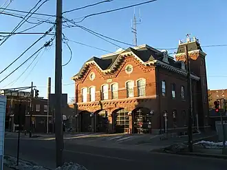 The Peabody Central Fire Station is a historic fire station at 41 Lowell Street in Peabody, Massachusetts, United States. Built in 1873, the two story brick building is one of the oldest active fire stations in the state. The building has Victorian styling, with a mansard roof, and two truncated gables on its front facade. The cornice is studded with regularly spaced brackets, and a tower rises from the building's rear right corner.[2]