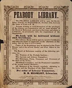 - ^ a b c d e f g h i j k l m n "Timeline of the Peabody Institute Library". Peabody Institute Library. Retrieved November 3, 2020.