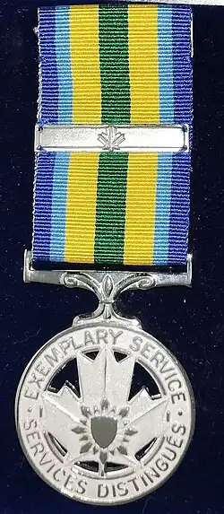 The Peace Officer Exemplary Service Medal (French: La Médaille pour services distingués des agents de la paix) is a Canadian service medal for peace officers. The medal honours 20 years of exemplary service by peace officers as designated by the governor general. It is, within the Canadian system of honours, the sixth and newest of the exemplary service medals.[2]