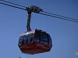 The 28 CWA-manufactured gondola cabins hold 28 people each, with 22 seated and 6 standing.[2] Twenty-six of the cabins are painted red and white, while the remaining two are painted blue, and have glass floors.