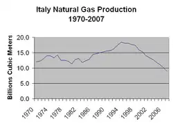 Italy's major oil and gas company is Eni. Formerly state-owned, it was privatized during the 1990s, but the government still retains around one-third of the shares. Natural gas reserves in Italy were 164 billion m3 at the beginning of 2007. Natural gas production in 2005 was 11.5 billion m3, while consumption was 82.6 billion m3. The difference was imported. The primary sources of imported gas are Algeria, Russia and the Netherlands.