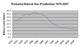 Natural gas in Romania was discovered in 1909 in the Sărmăşel area.[20] In 1917, Turda became the first European town lit up with natural gas. Maximum production of 29.8 billion m3 was achieved in 1976.[21] Today, gas provides about 40% of the country's energy needs.