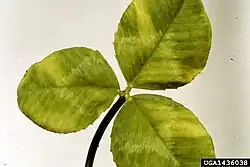 | Symptoms of peanut mottle virus in a clover leaf (Trifolium spp. L.) | |
