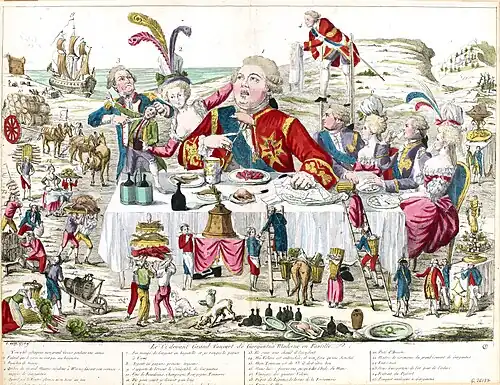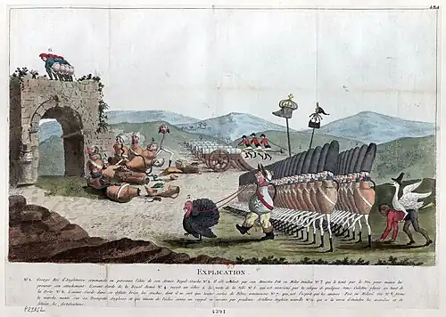 Other caricatures extended the pear's symbolic function to the entire body, reinforcing the metaphor by depicting a pear-shaped face on a pear-shaped body.[145] These representations are connected to physiognomic analysis, as noted by Martial Guédron, a field that also examined signs derived from the entire body, particularly the abdomen.[146][N 7] However, these caricatures focused on exaggerating the king's physical form, which, in turn, indirectly challenged his symbolic body—the foundation of his legitimacy.[148]