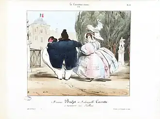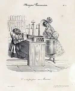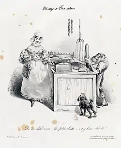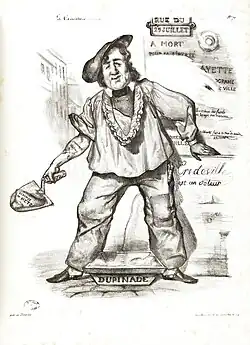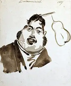 Charles Philipon was born in Lyon in 1800, the son of a wallpaper merchant. At the age of 23, he moved to Paris to pursue an artistic career.[47] To support himself, he initially worked for image makers on Rue Saint-Jacques and for manufacturers of labels and rebuses, illustrating numerous affordable story sheets.[48] From 1824 onward, he began studying lithography[49] while specializing in producing individual works, which were sold as separate sheets.[50] His early works were focused on popular subjects, including fashion series, caricatures of manners, and comic advertisements, although they did not stand out as exceptional.[51]