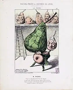 As Gabriel Weisberg noted, interpreting lithographs produced during the July Monarchy can be challenging today due to the artists' use of multiple layers of meaning intended for different audiences, as well as their references to fleeting events while also aiming for a certain universality.[114] The pear became a multifaceted symbol. On one hand, as an emblem of the king, it represented both his face and body, with various connotations, including scatological and sexual meanings.[115] On the other hand, it expressed the "graphic convergence of the three elements constituting the July Monarchy": its sovereign, its social base—the bourgeoisie—and its ideology of moderation.[116] Finally, it was associated with political humor.