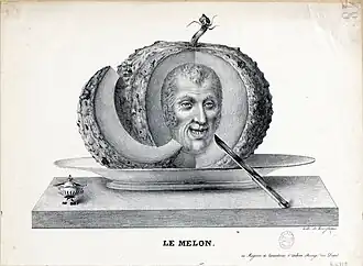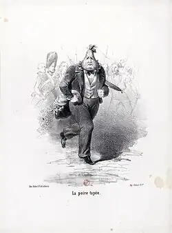 The pear became closely associated with King Louis-Philippe and is considered an emblem of the July Monarchy.[4][5] This association has led to two common misconceptions: the belief that "pear" referred to a fool at the time, justifying its use, and the incorrect attribution of the emblem's creation to Honoré Daumier, when Charles Philipon claiming it as his own.[6][7]