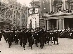 The peasant armament support march of 1914 (Swedish: Bondetåget) was a demonstration primarily of Swedish farmers on February 6, 1914 in Stockholm. It resulted in a constitutional crisis triggered by the Courtyard Speech held by King Gustav V to the marchers at Stockholm Palace. 30,000 participated in the march according to Britannica.[1]