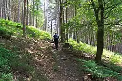 Almost 1 mile (1.6 km) east of Pitch Hill, wholly within Shere parish bounds and slightly closer to Holmbury St Mary, is Holmbury Hill – this is a Bronze Age multivallate hill fort;[9] its elevation is 261 m (856 ft) AOD.[10] Further to the east is Wotton and Abinger Commons.