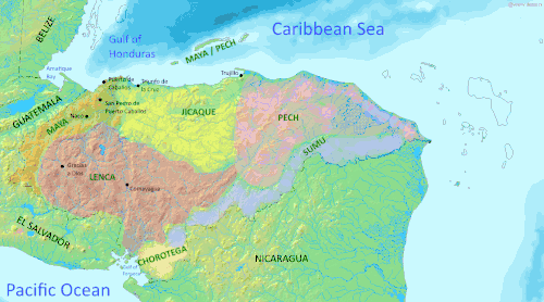 Before the colonial period in the sixteenth century, the Pech people migrated from the south to inhabit a large territory close to the border of Nicaragua.[1] The Pech Indians occupied a large portion of north-eastern Honduran land, which anthropologists define as "lower Central America."[3] According to anthropologists, this lower sector of Central America was considered to be a part of the "lesser-developed intermediate area of Honduras."[3] This land that the Pech people occupied was greatly reduced following conflicts with neighbouring community, the Miskito.[1]