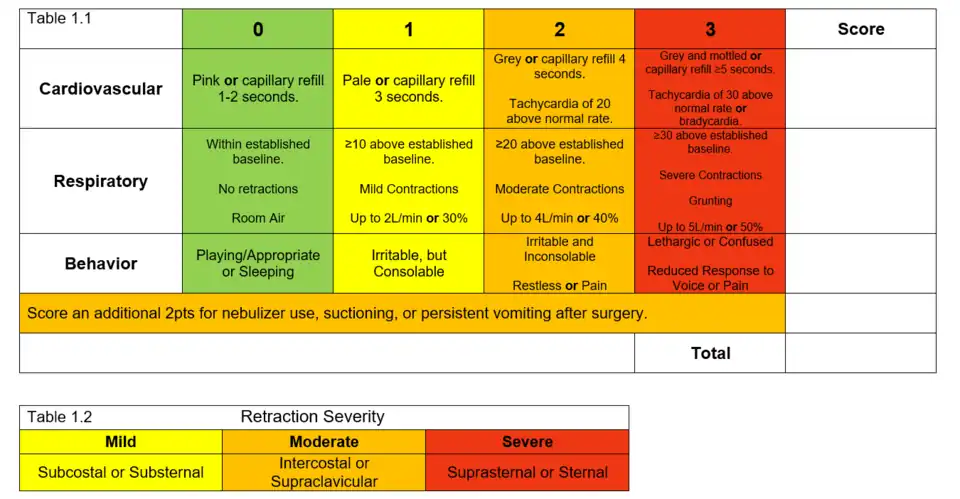- A score of 0-2 indicates no change in a child's status and regular rounding is acceptable. The plan of care will be continued as is.[35]