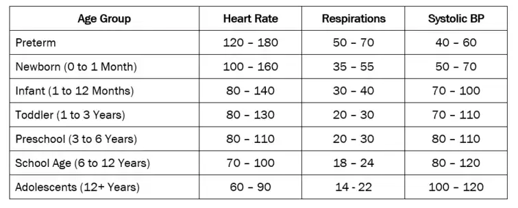 Pediatric patients' vital parameters vary by each age group and are different than an adult's healthy range. When reviewing vital signs in each of the age groups, be alert for significant changes and compare with normal values for each of the signs. For best results, when taking vital signs of infants, respirations are counted first before the infant is disturbed, the pulse next, temperature, and then blood pressure last.[16]