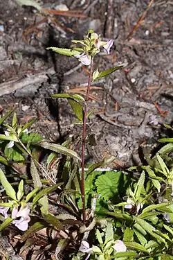 Pedicularis racemosa is a species of flowering plant in the family Orobanchaceae known by the common names sickletop lousewort and leafy lousewort. It is native to western North America, where it grows in coniferous forests. This is a perennial herb producing several stems up to 80 centimetres (31 in) tall, greenish to dark red in color. The leaves are up to 10 centimetres (4 in) long, linear in shape and lined with teeth. The inflorescence is a small raceme of flowers occupying the top of the stem. Each white to light purple or yellow flower is up to 1.6 centimetres (2⁄3 in) long and is divided into a curved or coiled beak-like upper lip and a wide three-lobed lower lip. The fruit is a capsule over a centimeter in length containing smooth seeds.