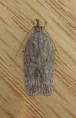 The wingspan is about 20 mm. The forewings are pale grey covered with dark flecks. The hindwings are plain grey.[2]