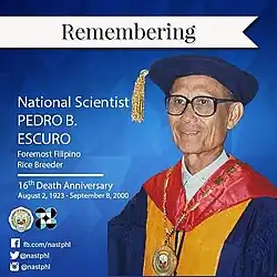 Pedro B. Escuro (2 August 1923 – 8 September 2000) was a Filipino scientist who specialized in genetics and plant breeding.[1] As a plant breeder, he made significant contributions to rice breeding. He provided guidance for the development, isolation, and release of nine Seed Board rice varieties: Milpal 4, HBD-2, Azmil 26 and C-22 for upland rice production, and C-18, C4-63, C4-137, C-168 and C-12 for lowland rice production.[2]