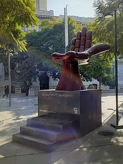 Friedeberg has painted, created murals for institutions in Mexico and abroad, illustrated books and book covers, created furniture and set designs.[8] He was the art director, along with Sergio Villegas of a spectacular called Arbol de la Vida.[3] He began designing furniture in the 1960s, rejecting the then-dominant international style of architecture. He has designed chairs, tables, couches and love seats in fantastic designs.[1][3] He is best known for his hand-chair, which has sold more than 5,000 copies since it was created in 1962.[5] The original chair was made of wood and covered in gold leaf.[9][10] It is designed to allow one to sit on the palm, using the fingers as a back and arm rest.[3] He has declared that he is never really relaxed and stated that he has painted one canvas per week, 52 weeks a year for the fifty years of his career in addition to sculptures and chair designs.[6] His paintings, sculpture and furniture was very fashionable, called “chic” in the 1960s and 1970s.[2]